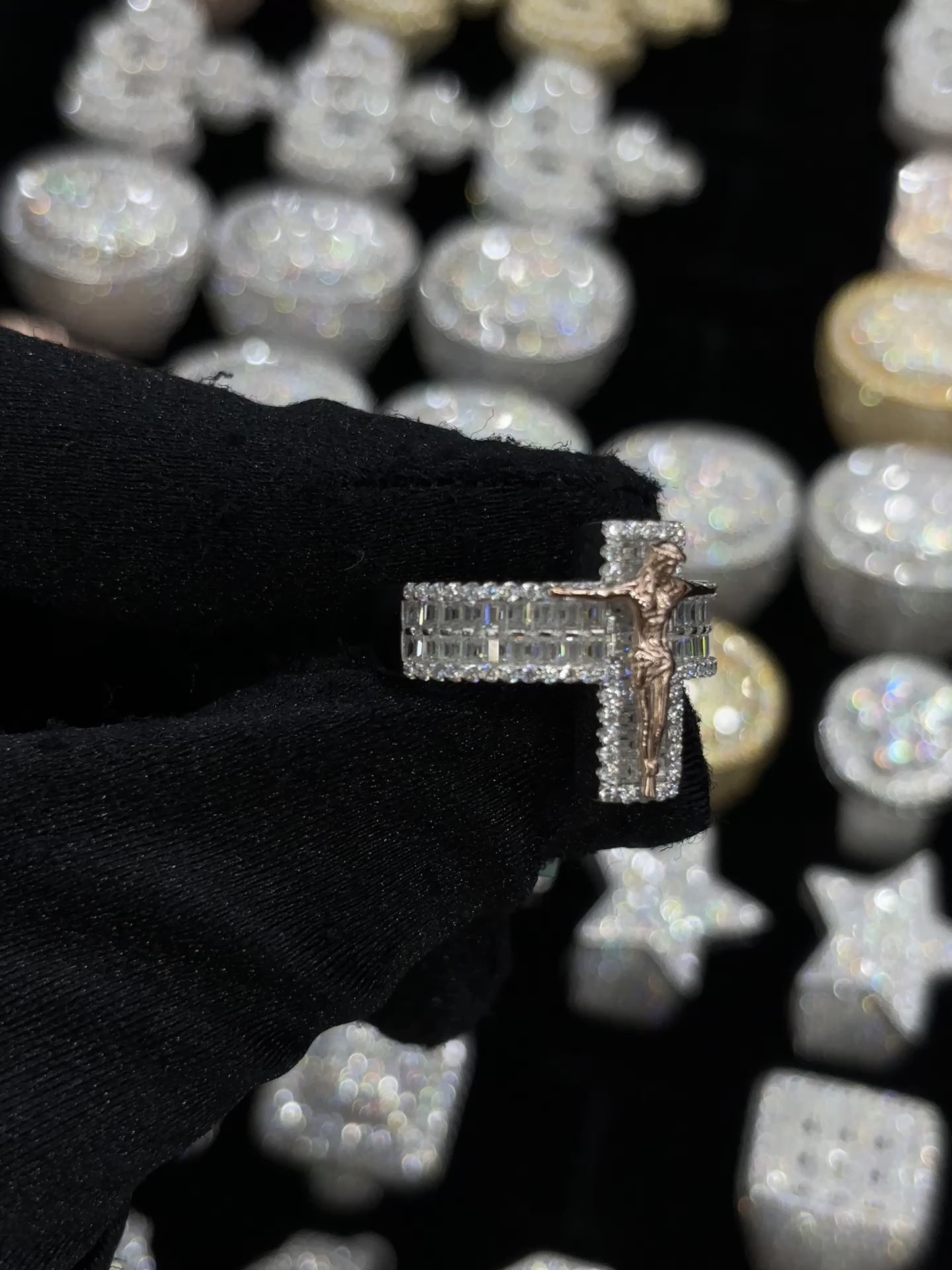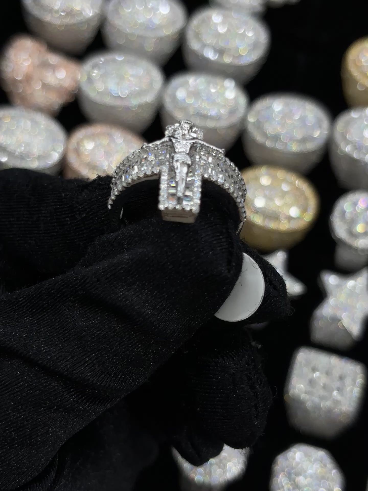 Elevate your collection with this luxury Moissanite Cross Ring, masterfully crafted in solid 925 sterling silver. Featuring a bold cross design lined with D-color VVS moissanite baguette and round stones, this piece delivers unmatched brilliance and presence. The sculpted crucifix center adds depth and artistry, making it both a spiritual symbol and a statement of refined style. Designed for everyday durability and high-end shine, this ring is the perfect blend of craftsmanship, faith, and luxury.
